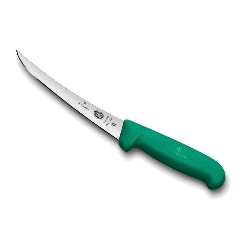 Ce modèle 5.6614 correspond à la version manche vert du couteau à désosser Victorinox (lame flexible, étroite, à dos renversé). Un couteau de cuisine professionnel qui fera notamment le bonheur des bouchers et apprentis au quotidien. Résistante à la corrosion/rouille, la lame en inox (longueur au choix 12 ou 15cm) est flexible, ce qui permet d’accéder aux zones difficiles en toute simplicité. N’oubliez pas qu’il est possible de graver un prénom, une date ou n’importe quel court texte au dos de la lame (voir bouton ajouter une gravure). Comme déjà mentionné, ce couteau à désosser Victorinox 5.6614 est muni d’un manche vert, permettant ainsi de facilement l’identifier sur la table des découpes. Cette poignée verte est fabriquée en fibrox, un matériau qui séduit pour son ergonomie (doux au toucher et antidérapant pour plus de sûreté). Cerise sur la gâteau, le logo croix Suisse Victorinox est discrètement déposé, l’assurance de faire plaisir aux fans !
