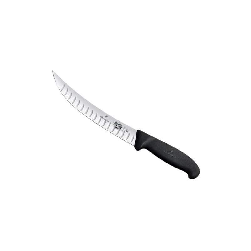C’est indéniable, le couteau abattre a parfaitement sa place sur le plan de travail d’un boucher. Ce modèle 5.7223, signé Victorinox, célèbre fabricant Suisse à la renommée mondiale, est doté d’une lame étroite à dos renversé qui est alvéolée afin que les morceaux de viandes et volailles découpés ne restent pas « collés ». Fabriquée en acier inoxydable résistant à la corrosion, la lame de ce couteau à abattre est tranchante et puissante, si bien qu’elle est en mesure de couper les os ! Recouverte d’alvéoles, elle est aussi marquée par de nombreux motifs, comme le logo Victorinox bien entendu ! Concernant la lame, deux longueurs sont au choix : 20 ou 25cm.