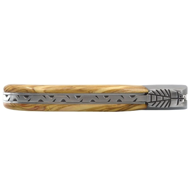 PrĂ©sentant un guillochage Ă©lĂ©gant et soignĂ©, le manche est confectionnĂ© en olivier, un bois Ă la teinte claire et au veinage plus foncĂ© pour un beau contraste. L’extrĂ©mitĂ© du manche est fine et courbĂ©e, pour une note stylĂ©e mais aussi une prise en main plus confortable. LivrĂ© avec son Ă©tui en cuir.
