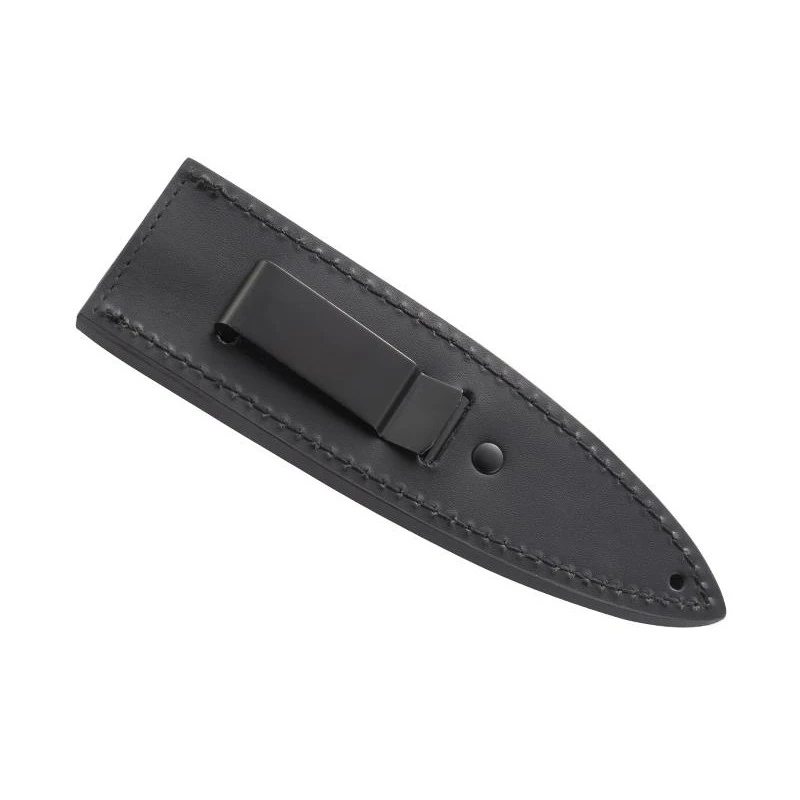 Ce couteau offre une utilité éprouvée grâce à sa forme de lame classique, qui vous permettra d’accomplir diverses tâches. Sa poignée en acier inoxydable renforcée de fibres résinées allie à la fois solidité et attrait visuel. Vous apprécierez la qualité supérieure de cet outil, notamment son étui en cuir véritable avec clip, qui assure une protection durable.