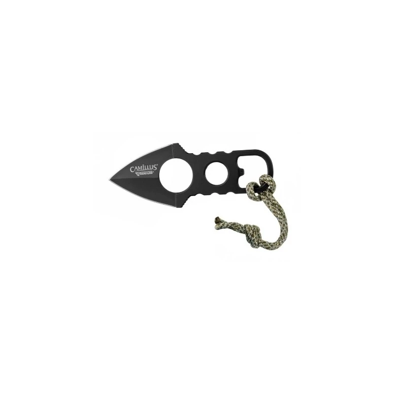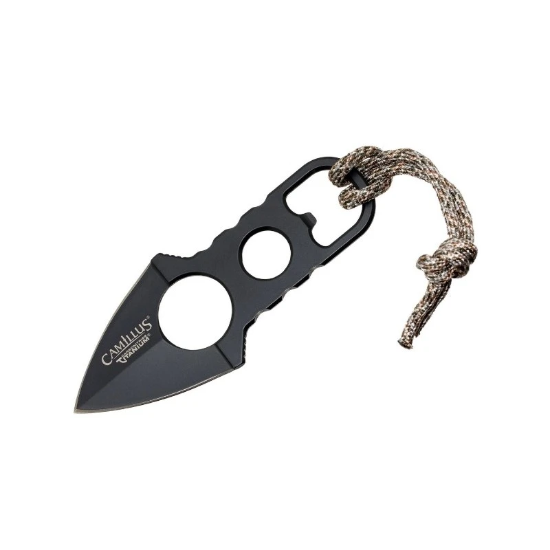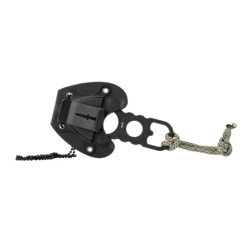 Le manche squelettique du couteau améliore son design tout en réduisant le poids total, rendant l’outil léger et maniable. Une fonction décapsuleur intégrée est présente, renforçant ainsi la polyvalence du couteau. Le cordon en nylon à motif camouflé facilite l’attachement et le transport du couteau.