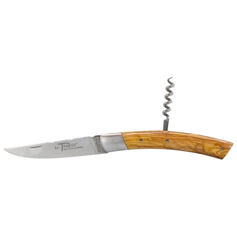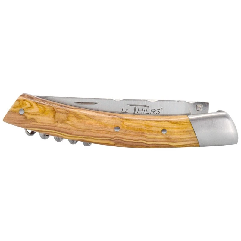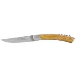 De forme courbée pour plus d’élégance, le manche est confectionné en olivier, dont la teinte est claire avec un veinage plus foncé. Intégrant une mitre protectrice en inox, il comprend également un tire-bouchons pour vos apéros improvisés, toujours avec modération. Sa longueur de seulement 85mm fait que le couteau pourra être facilement emporté au quotidien.