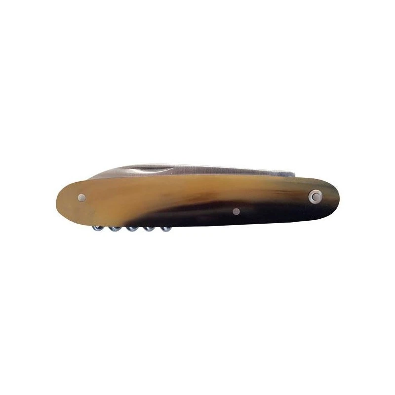 Élégamment conçu, le couteau Navette Douris Chastel 2 pièces DC842CB est un chef-d’œuvre de l’artisanat français. Sa lame en acier Sandvik 12C27 de 9 cm témoigne de la robustesse et de la précision, promettant une coupe impeccable. Le manche en pointe de corne ajoute une touche authentique, alliant esthétisme et ergonomie pour une prise en main parfaite. Doté d’un cran forcé, ce couteau garantit une utilisation en toute sécurité. Le détail des rivets et de la rosette en inox souligne son caractère distinctif. En tant que modèle 2 pièces, il est également équipé d’un tire-bouchon à mèche trempée à 5 spires, ajoutant une fonctionnalité supplémentaire à son design. Avec une longueur totale de 17,8 cm, le Navette Douris Chastel est la parfaite fusion entre tradition et modernité. Livré avec son étui en cuir.