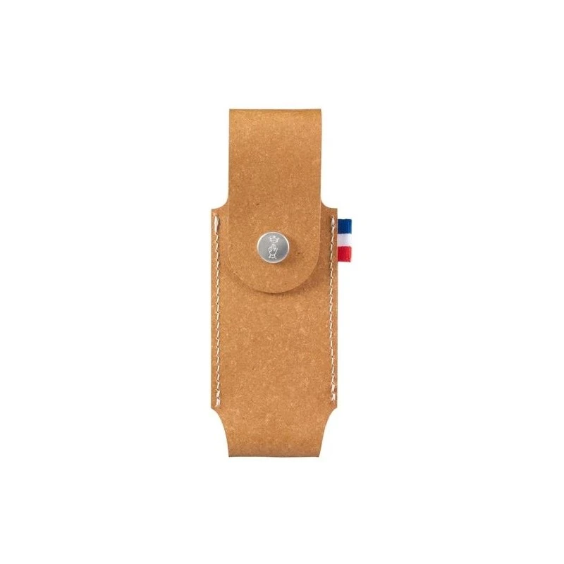 Le cuir régénéré utilisé dans cet étui est un matériau écologique. Il est fabriqué à partir de chutes de cuir recyclées et reconstituées, offrant ainsi les avantages du cuir tout en réduisant l’impact environnemental. Le passant-ceinture intégré permet un port vertical, assurant que votre couteau reste accessible et bien sécurisé. Le bouton de fermeture est marqué par le logo de la marque Opinel.