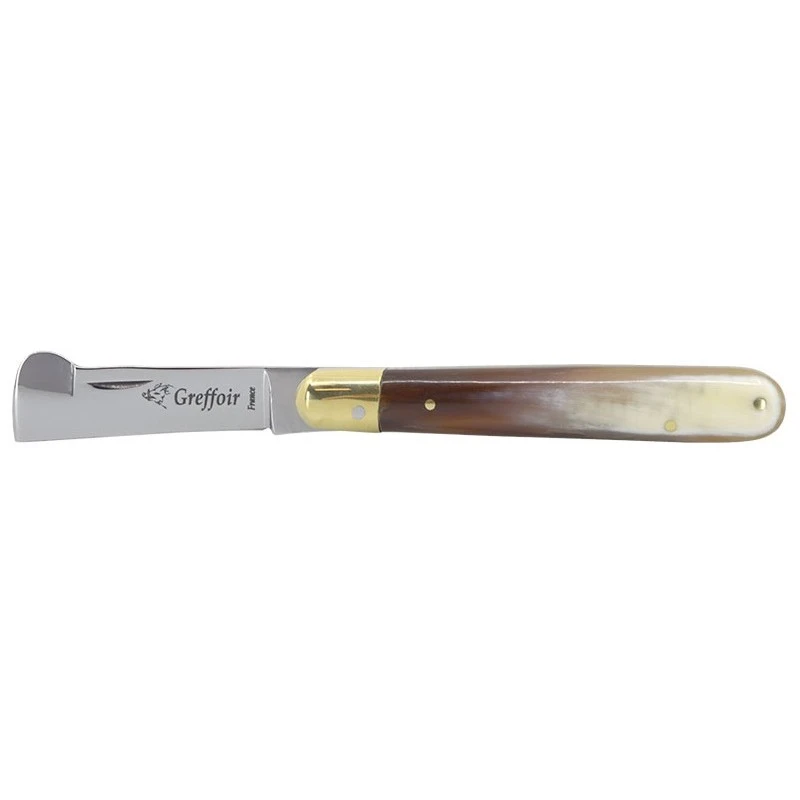 Ce greffoir droit, signé la coutellerie Chevalerias, est un incontournable du jardinage, pour effectuer les greffes des végétaux. De fabrication française, il est composé d’une lame greffoir de 5cm en acier carbone ainsi qu’un manche en corne pressée claire avec mitre en laiton. Veuillez noter qu’il s’agit d’un modèle pliant, où la lame se replie dans le manche : il est ainsi plus facile de l’emporter, en le glissant très simplement au fond de la poche. L’ouverture de la lame est simplifiée par une entaille pour ongle.