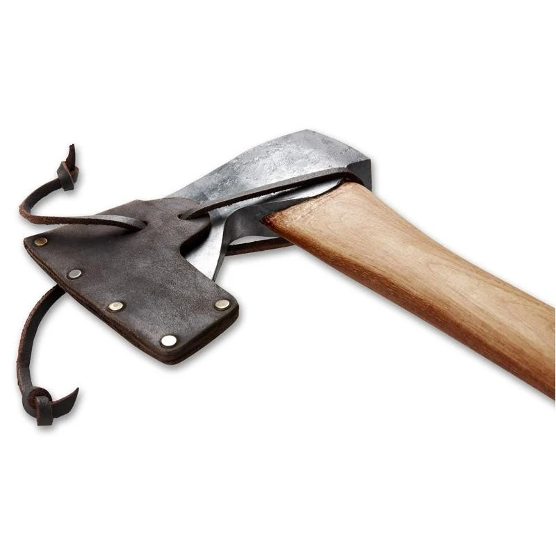 Le manche droit est une fois n’est pas coutume conçu en bois hickory américain traité à l’huile de lin. Sa longueur est de 50cm, et il comporte également un trou pour cordon. Livrée avec son étui protecteur en cuir, en boîte individuelle.