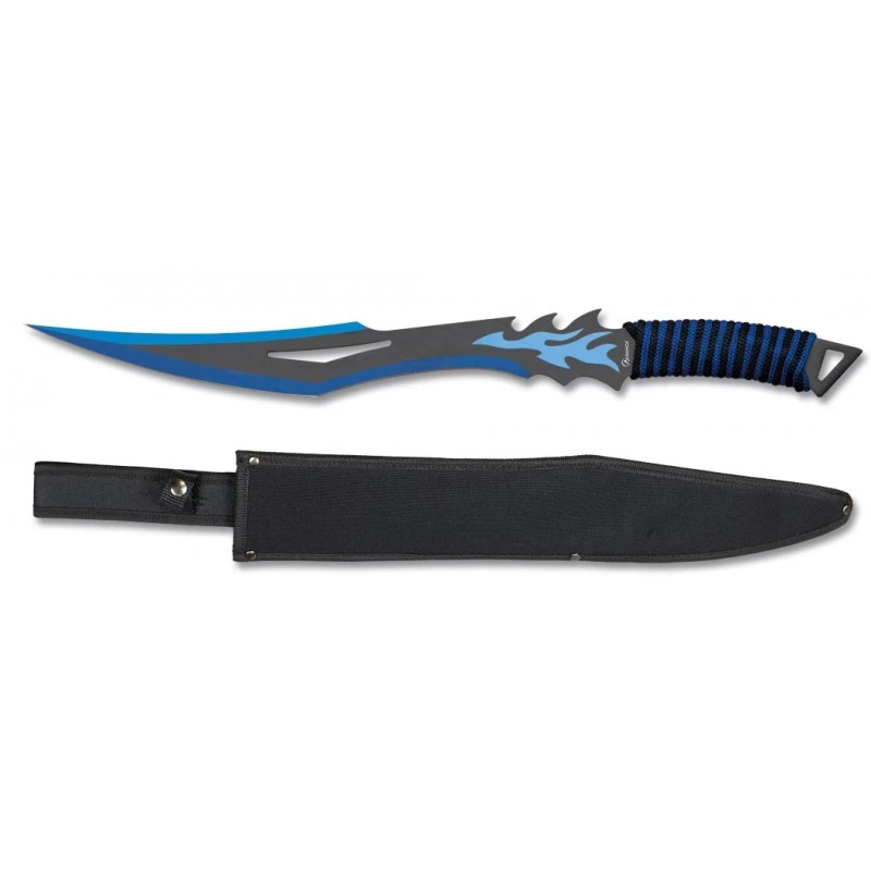 Son manche de 13,5 cm, enveloppĂ© d’une corde bleue, offre une prise en main confortable, mĂŞme dans des conditions difficiles. Ce manche encordĂ© amĂ©liore le grip, rĂ©duisant ainsi les risques de glissement lors de l’utilisation. Ensemble, lame et manche forment une machette de 51 cm de long. Elle est livrĂ©e avec son Ă©tui en nylon, qui vient faciliter le transport et le rangement au quotidien.