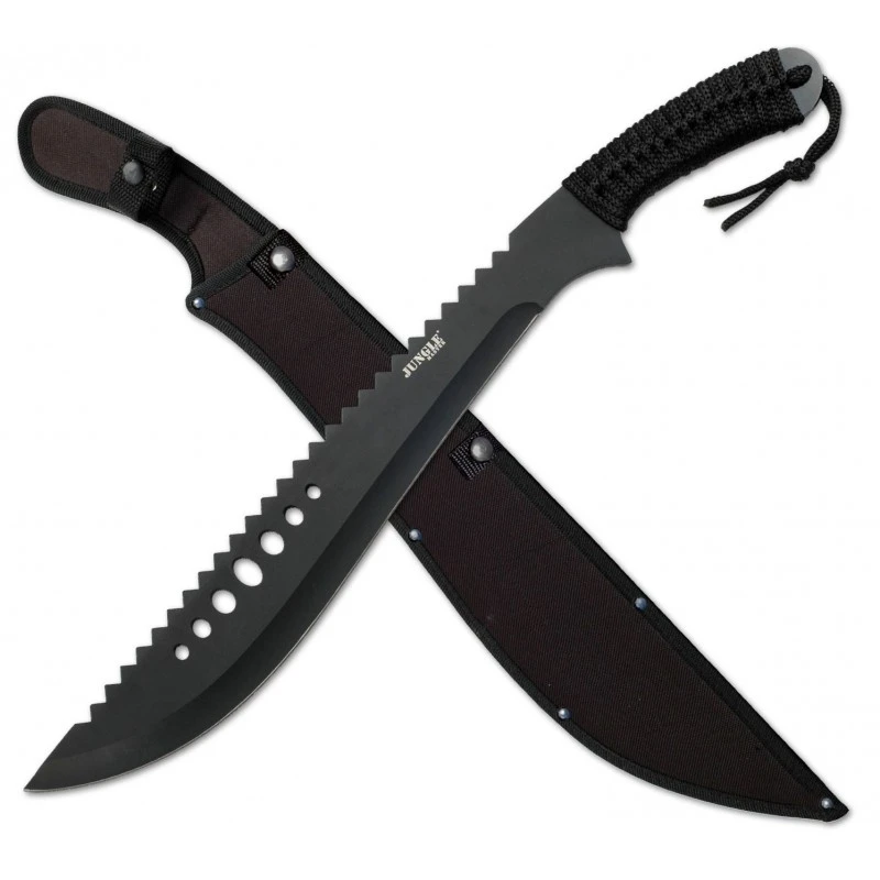 La Jungle Master JM-031B est une machette robuste, de fabrication full-tang (pleine soie) en acier inoxydable 3Cr13. Ajourée à de multiples reprises, la lame est revêtue de noir et comporte des dentelures au dos pour davantage de polyvalence à l’usage. Elle est marquée du logo Jungle Master dans une teinte contrastée, ce qui le rend particulièrement visible.
